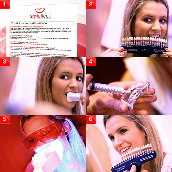1) Die Vorabinformationen werden mit dem Kunden besprochen. 2) Mit dem Nuancer (Farbscala) wird die aktuelle Zahnfarbe festgehalten. 3) Reinigung mit dem Fingerbrush. 4) Die 1. von insgesamt 3 Mundschienen wird mit dem smileZERO Gel gefüllt. 5) 3 x Mundschienen je 10 Minuten (mind. 21 Minuten). 6) Messen der neuen Zahnfarbe.